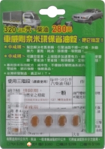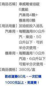 ※汽車用與機車用省油錠成份相同,可互相搭配使用。 例如: 汽車加油60公升, 可投入半顆汽車用省油錠(大)和兩顆 機車用省油錠(小)。